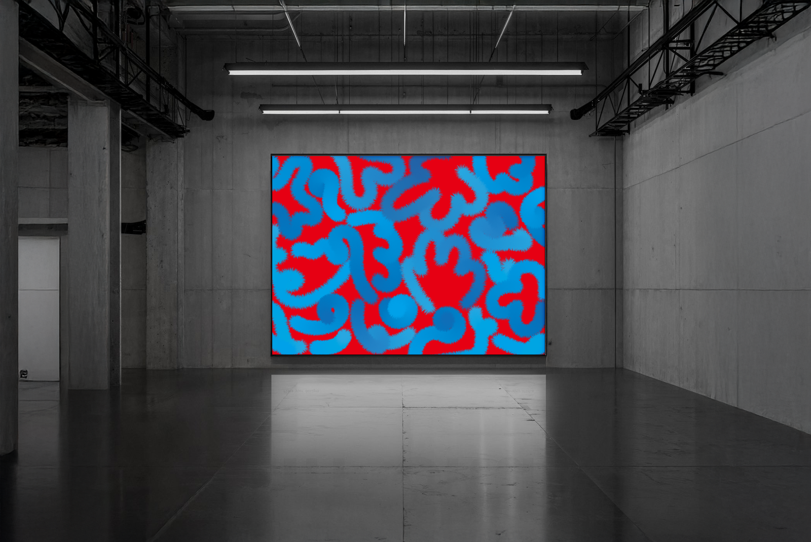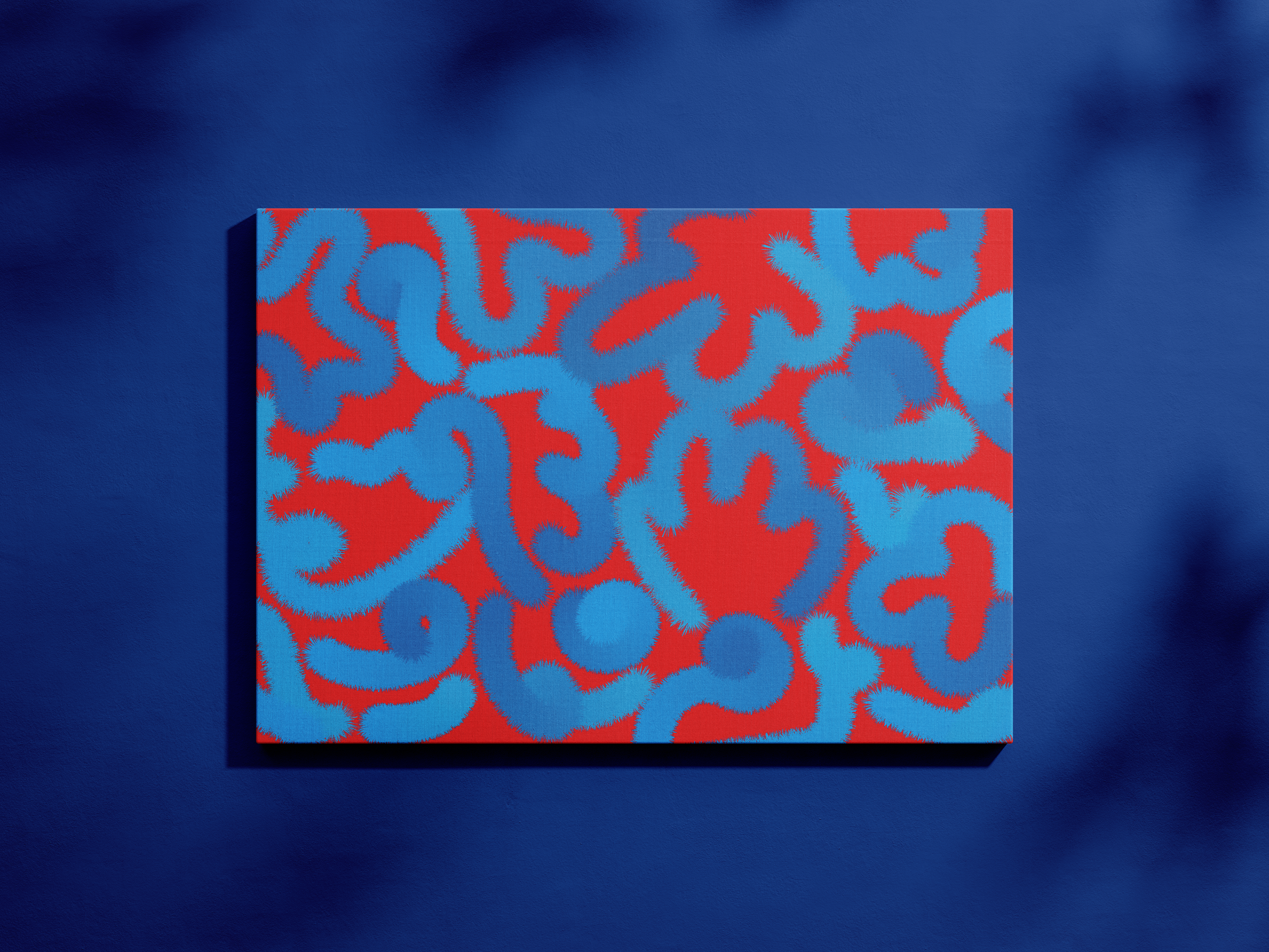 Intentional bonds weave through fleeting, indifferent encounters, and between them drifts a subtle, thorny tension. Blue lines ripple over a field of red, carrying both sleekness and edge, meeting and withdrawing at each other’s borders. Yet the spaces they leave behind cradle the possibility of something new.